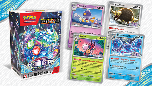 Cada caja de Combina y Combate contiene cuatro paquetes de mejora de Escarlata y Púrpura-Corona Astral y una baraja de 40 cartas lista para jugar con cartas importantes de esta expansión y de expansiones anteriores, además de una de las cuatro cartas holográficas de promoción con las que mejorar tu baraja de Prelanzamiento. Según la carta de promoción que obtengas, podrás añadir a tu baraja al genial Bouffalant, al autodestructivo Drifblim, al irascible Crabominable o al ágil Ledian. Sea cual sea la carta de promoción que recibas, ¡seguro que dará forma a tu estrategia en el Prelanzamiento!